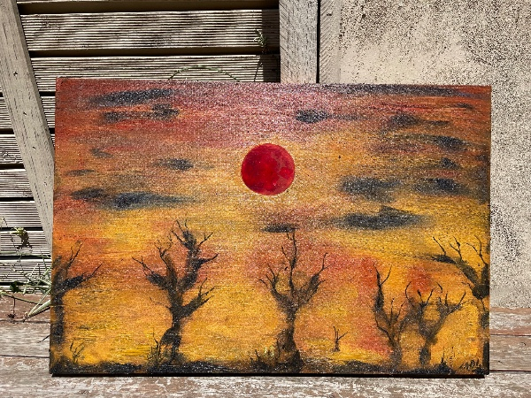 It was a day of extreme heat not long after the days others have suffered and lost what was once theirs. In my heart I feel the fear for those still threatened by what is to come. I started a painting, one with no end idea, but only to allow whatever was to come through, to come. As the painting progressed I started to feel that it was an expression of the emotions and the suffering that was currently happening. As if the energy had come through, to then express into this piece of art. As I finished this piece it was like everything aligned, and my question of “what can I do?” became clear to me.
